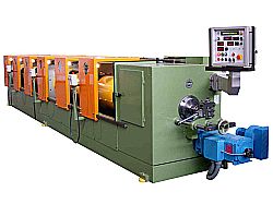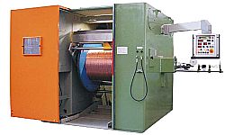 Unser Produktionsprogramm ist spezialisiert auf die Herstellung von Stahlbügel-Schnellverseilmaschinen von 3 bis 14 Spulen in den Größen 200 bis 1600 mm Durchmesser, sowie Rohrverseilmaschinen von 2 bis 45 Spulen bis 630 mm Durchmesser mit Zentrallagerung, darüber mit Unterstützungsrollen. Die spezielle Konstruktion der Lagerständer ermöglicht eine fundamentlose Aufstellung der Maschine, wodurch die Aufstellungs- und lnbetrieb- nahmekosten erheblich reduziert werden. Alle Maschinen sind mit elektronischen Steuerungen und patentierten Sicherheitsüberwachungen ausgestattet. Die Abzüge sind elektrisch angetrieben und mit stufenloser elektronischer Schlaglängenregelung mit digitaler Anzeige ausgerüstet. Die Abzugscheiben sind aus legiertem Stahl, hochfrequenzgehärtet und unterliegen daher keinem Verschleiß. Die Beschickung der Anlagen kann mittels Roboter vollautomatisch erfolgen. Die Aufwickler werden in allen gewünschten Varianten und Größen hergestellt. Weiters stellen wir Einfach- und Doppelschlagverseilmaschinen mit digitaler elektronischer Regelung für Aufnahmespulen von 630 bis 1600 mm Flanschdurchmesser her. Die Einfachschlagmaschine SE eignet sich besonders zur Herstellung von Computerkabeln mit hohen Datenübertragungsraten sowie Telefon-, Steuer- und Energiekabeln in Kombination mit Ablaufsystemen wie Tangentialabläufen mit und ohne Antrieb, rotierende Abläufe sowie Feststehende vom Faß oder Bürstenabläufe und alle Bandabläufe wie Zentralbandwickler, Abbindespinner und Tangentialabläufe in allen Varianten. |