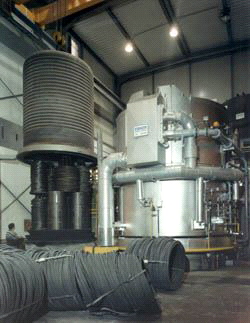 La firma EBNER Industrieofenbau, fundada en 1948, diseña y fábrica, instalaciones de tratamiento térmico, para la industrias del acero, aluminio y cobre. La tecnologia de recocido HICON/H2®, desarrollada por EBNER, ofrece vantajas decisivas para el tratamiento térmico de alambre metálico. Mediante la aplicación de hidrógeno como gas protector y un potente dispositivo de circulación del mismo, se consiguen condiciones, las cuales producen una óptima transmisión del calor con una atmósfera pura de recocido. De este modo se alcanzan las propiedades más importantes para el procesamiento posterior del alambre: máxima limpieza superficial y valores mecánicos homogéneos. Esto junto con un simultaneo aumento de la capacidad de recocido y reducción de las exigencias especifica de trabajo, es decir, mejor calidad al incrementarse la productividad. El campo de aplicación del horno de campana HICON/H2® incluye, el recocido blando, recocido de globulización y de recristalización de alambres de acero de alto y bajo contenido de carbono, con una sección redonda, plana o perfilada, hasta calidades de alta aleación como aceros al cromo, aleaciones NiFe, así como recocidos de recristalización y de estado en alambres de metales no férricos y aleaciones especiales. Aparte de los equipos de recocido, EBNER también suministra todas las instalaciones electricas/electronicas para el funcionamiento del Horno hasta automatización de procesado, así como los correspondientes instalaciones de gas protector y las ayudas de carga. Asimismo, EBNER ofrece a las clientes interesados la posibilidad de convencerse por si mismos, sobre las ventajas de la técnica de recocido HICON/H2®, mediantes efectuar recocidos de demostración, con cargas de la propia producción. |